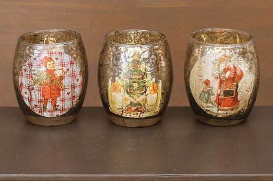 玄関先やリビング、ダイニングなど・・オシャレな明りの演出にぜひ♪【Xmasクリスマス】 アンティーク風 キャンドルホルダー(3種)ヴィンテージ風のイラストと全体にほどこされたアンティークゴールドの模様がとてもお洒落なガラス製の“キャンドルホルダー”です♪中にティーライトキャンドルをいれて灯すと、前面のイラストが美しく浮かび上がります。▲ ▲ ▲「左:女の子」 「真ん中:ツリー&エンジェル」 「右:サンタクロース」実際のティーライトキャンドルを入れるのはもちろん素敵ですが安全な「電池タイプのティーライトキャンドル」を入れてもとても素敵です。※「【電池で光る!】ティーライトキャンドル 」も別売りでご用意がございますので ▼ ぜひ合わせていかがでしょう♪ ▼ ※「電池で光るティーライトキャンドル」はほんのりと灯りにゆらめきがあって限りなく本物の灯火に近い雰囲気を醸し出せるライトです。※中に入れるキャンドルはティーライトタイプのキャンドルをご利用ください。※キャンドルをご使用中はホルダーグラスが熱くなりますのでご注意ください。(「電池タイプのティーライトキャンドル」をご利用の場合は熱くなりません) 【キャンドルホルダーサイズ】φ80 h90mm     【素材】:ガラス製 ※当商品は素材および製造工程の特性上、塗料の若干の色とび、色むら、はみだし、かすれ、若干の色の混合などがある場合がございますが、その点あらかじめご了承ください。