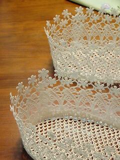 まさに、“レース”で編みあげられたような繊細で美しいオーバルの小物入れです。実際には特殊な樹脂コーティングがほどこされていて、レースのようにクタクタすることはありませんが、柔らかな風合いは細部まで非常にうまく演出されていてとっても素敵です。ハンドタオルなどをまとめておいたり、メイク小物などをまとめたり、ほかにもペーパーナプキンやティータオルなどを一枚しいて、ブレッドトレーにするのもお洒落ですね。サイズはMサイズとLサイズ。サイズ違いでディスプレイしながら収納するのも素敵です! 【Mサイズ】約W200 D140 H80mm【Lサイズ】約W240 D160 H80mm【素材】:ポリエステル(樹脂コーティング)