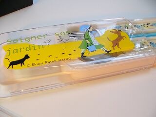 Shinzi Katoh トリオセット「お箸」と「スプーン」と「フォーク」の3点がセットになったイラストも愛らしい、Shinzi Katohさんデザインの『トリオセット』です♪ 水色のスカーフをして、水色のバッグをもった女の子・・ワンちゃんとくろねこちゃんとお散歩?はたまたピクニックでしょうか^^きれいな水色をメインカラーにした、さわやかでかわいらしいセットになっています。可愛いケースと3つのグッズでこのおねだんは、なかなかリーズナブルです♪いつものランチタイムがぐっと楽しくなりそうですね!お気に入りのお弁当箱やランチバッグと一緒にぜひ♪【サイズ】ケース:W19.5/D8.2/H1.8cm(フタ:ポリスチレン/外トレイ:ABS樹脂)スプーン・フォーク:各13.5cm【素材】(把手:ABS樹脂)はし:16.8cm (ABS樹脂)  (ケースはスライドタイプです)                         (フォークの柄が違いますが大きさは同じです)