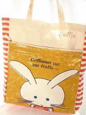 久々の再入荷です!! マザーズバッグに、ピクニックバッグに♪容量たっぷり、ポケットも使いやすい!!Facil シリーズ 帆布トートバッグShinzi KatohのFacil シリーズから帆布のトートバッグのご紹介です!!ヨットの帆に使われる丈夫な生地をつかった大きめのトートバッグです。2つに区切られた中ポケットとジッパーつきの 大きな外ポケット(イラスト面全面)がついて使い勝手、収納力とも抜群です!!【サイズ】バッグ本体 : 約H38cm×W 33cmマチ : 約9cm外ポケット : 約H28cm ×W33cm内ポケット : 約H20cm×W22cm(内ポケットは12cmと10cmに区切られています)持ち手の長さ : 43cm(持ったときの、本体の上の淵から持ち手のトップまでは約20cm)【素材】 綿100%SHINZI KATOHさんの描くイラストにはほのぼの、ワクワクとしてしまう なんともいえない、ハートウォーミングな魅力があります。 は青い目のうさぎさんがモチーフです。前面にはあやとりに夢中のうさぎさんが。両サイドは白と赤のストライプ♪  後ろには アリさんと遊ぶうさぎさんと、飛行機が。底のマチ部分は赤で、白抜きの「Facil」ロゴが。         ロゴもかわいいですよね~^^中ポケットには携帯やハンカチをいれたり外ポケットはジッパーつきですので、すぐにとりだしたい、でも ちょっと大事な手帳やお財布などを。全部開くとかなり大きく開きますので、出し入れもとてもしやすいです。                                        (右の写真は「らくーん」)そして本体のバッグは、たっぷりとしたマチつきですので、ランチボックスやドリンク、レジャーシートにタオルお菓子や着替えなど・・・ザクザクいれて^^おでかけできます!持ち手は もちろん肩にかけられるサイズです。これからの季節の、プールや海などなにかと荷物が多くなるシーンにもピッタリです^^1泊~2泊の旅行にも十分使えると思いますよ!マグネットポイントが真ん中についています。                タグもかわいい♪ (写真は「らくーん」)