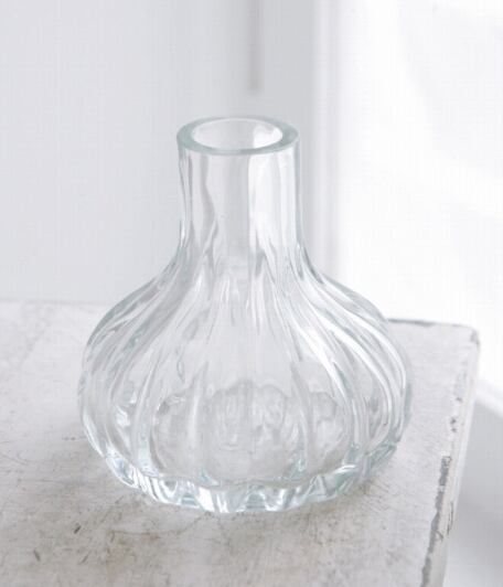 ガラスのフラワーベースぽってりとしたデザインがとてもかわいらしいガーリックフォルムのガラスのミニベースです。シンプルなデザインだからこそ飽きない、さりげなく置いても美しく溶け込むフォルム。いろんなパターンで使えて、長く愛されるデザインは一つあると重宝します。