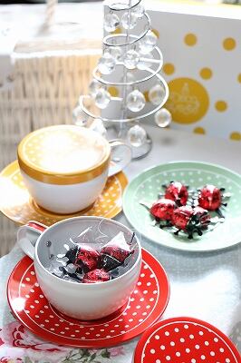 店主も実際にいただいてみましたが、まず一つ一つのチョコがてんとう虫の形をしていて見た目も本当に可愛いです!アルミ包装紙をとっても、中はてんとう虫型にかたどられていて感動します!ただ、こちらのチョコの魅力はデザインの可愛いらしさだけではないのです♪お味もなかなか本格的!ヘーゼルナッツの風味にコクがあり口どけもよく、したざわリもなめらかなとっても美味しいチョコレートでした★さすがスイス製!!チョコが入っている「ティーカップ&ソーサー」はドットの模様が可愛いらしく食べ終わったら小物入れにしたりディスプレイしたり・・♪「ピンクの手提げ袋(プリントパック)」もついていますのでぜひお早めにご注文くださいね♪♪・*:*・∴・*:*・∴・*:*・∴・*:*・∴・*:*・∴・*:*・∴・*:*・●無料ラッピング例●▼【1個からご注文ができる】ほうも是非ご覧下さい▼