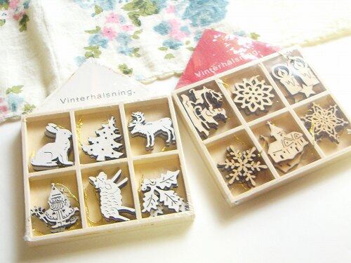 ウッドミニオーナメントセット6種類の小さな木製オーナメントが2枚ずつはいっていて計12ピースでワンセット♪クリスマスツリーのデコレーションはもちろん、小さなパーツなので、フラワーアレンジに使ったり、壁にプッシュピンでとめたり★おうち型のケースに入っていますので、プチギフトにもピッタリ♪