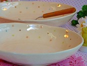 パステルドット オーバル~なごみ鉢~ どんなお料理にもあわせやすいシンプルなフォルムと淡いパステルドットのさりげないデザインそしててびねり風のわずかにラフなトップラインが“なごみ鉢”のネーミングの通り食卓の上をちょっとほっこりとした雰囲気にさせてくれます♪パスタやカレーなどはもちろん、和風・洋風・中華にと幅広くいろんなシーンでお使いいただけますしオーバル型ですので場所もとらず、浅すぎず深すぎずの使いやすいボウルタイプですのでちょっとしたおつまみやお菓子、またフルーツなどを盛り合わせてもしっくりと上品にテーブルの雰囲気を“なごませて”くれそうです♪    サイズ:245×165×H50mm素材:陶器