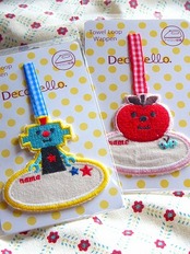 Decole Decollelo ~ タオルループ&ネームタグ(アイロン式ワッペン)~ キュートなリンゴやカッコ可愛いロボットをモチーフにした“アイロン式ネームワッペン”です♪こちらをタオルハンカチの角に付ければ“ループ付きタオル”のでき上がり★ ネームタグとしてだけお使いになりたい場合はループをはずしたりみじかくすればOK♪絵本袋やハンドメイドバッグなどの素敵なアクセントになってくれます★ 「りんご」のほうは赤いギンガムチェックのループに「赤いりんご」のモチーフ、「ロボット」のほうはブルーのギンガムチェックのループに「ロボット」のモチーフ。「りんご」はピンクで、「ロボット」は黄色でほどこされたパイピング刺繍やちょうちょやお星さまのミニ刺繍もポイント♪ 【サイズ】台紙サイズ:縦7.3cm 横12.2cm 1個サイズ:約 幅6.4cm 高さ10.3cm