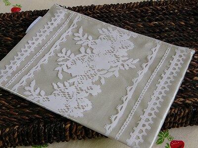 ア・レーズ フラットポーチレースシルエットが美しく、上品で可憐なイメージのフラットポーチです!ホワイトonホワイトのプリントが清楚で洗練されたお洒落さを感じさせてくれます。 こちらはレース&ローズのプリントが、やさしく淡い色調でプリントされたさわやかで かわらしいデザインです。 マチがあると、かえってバッグの中でかさばってしまうことって ありますよね。コチラのポーチはフラットなので少しの隙間にもきれいにおさまります。幅が、約18cmありますので、通帳や保険証などをいれるのにも便利ですしビニールでカバーリングされていますのでこれからの季節 温泉のおともに小物をいれて持ち歩いたり♪また旅先での洗面時なども、心配なくつかえますね。中はナイロン素材です。外側はビニール素材でカバーリングされていてレースとローズ柄のプリントがされていています。パッと見にはレースのポーチかな?という感じです♪ バッグの中で何度もだし入れしているとコットンはどうしてもよごれが目立ってきてしまいます。また、汗やファンデーションなどで生地がよごれることって結構ありますよね。ビニール素材だとよごれの心配もありません^^ レースの上品でやわらかな雰囲気とよごれない便利さと両方を兼ね備えた、お役立ちのポーチです。【サイズ】 約13cm×18cm【素材】 内側 :ナイロン 外側 : ビニール★その他の「ア・レーズ」シリーズもぜひご覧ください★