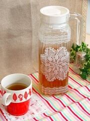 ドイリーレース ガラスポット(L)ドイリーのシルエットとレースのラインが繊細でかわいらしくポットのぽってりしたシルエットもどこかなつかしくアンティーク風でお洒落です♪ ▼(以前の「四角」ボディ) Newバージョンの「八角」ボディタイプ▼ ドイリーレースの雰囲気や配置は全く一緒なのですがボディの形状が八角形になったので、冷蔵庫のサイドポケットなどへの出し入れが四角のものよりもずっと楽になりました♪ こちらの「ドイリーレースガラスポット」は本物のレースがついているのかな?と見間違うほどの雰囲気ですが実際はとてもきれいにプリントされています。そのままキッチンに飾っておいても素敵なアクセントになりそうですよね♪思い切ってフラワーベースとして使ったりしてもお洒落!麦茶やお水を冷たく冷やして、またパーティなどではジュースやサングリアなどをいれても素敵です♪いろんなシーンでぜひ活躍させてくださいね。  サイズ:φ7.8×8.4×12×H24.2cm素材:(本体)ガラス、(ふた)プラスチック容量:1000cc▼こちらは「四角」ボディタイプですがレースの雰囲気などは同じですのでご参考までにご覧ください。 ▼ ▲ .レースの模様が飲み物を入れるとなお一層引き立って楽しい♪