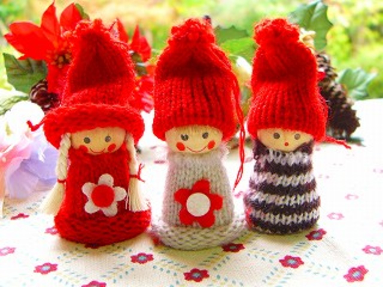 スモールクリスマスガール 3個セット親指サイズのちょこんとした雰囲気がなんとも愛らしいオーナメントオブジェです。ニットの大きな帽子とお洋服そしてほのぼのとした表情に温もりを感じます。フラワーアップリケやシマシマのお洋服もとってもキュート♪クリスマス以降もウィンターシーズン中長くお楽しみいただけるデザインです。ドールサイズ:約φ2.5×H7cm素材:木、ニット、フェルト 帽子のトップにオーナメント用のループがついていますので壁やツリーなどに吊り下げることも可能ですしラッピングのアクセントなどにしても可愛いです!!プチギフトにもピッタリのかわいらしいアイテムです!